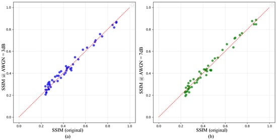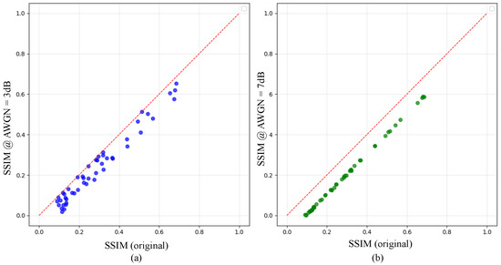 A comprehensive robustness analysis is performed to evaluate the performance of the model with varying noise levels, assessing its ability to generate high-quality outputs despite input degradation. The test protocol involves distorting input images with two distinct noise levels prior to model processing, i.e., 3 dB (low noise) and 7 dB (moderate noise). This setup simulates real-world scenarios where thermal images may be subject to various forms of noise or distortion. The model’s performance was quantitatively monitored using SSIM. SSIM values were computed for each noise level, and scatter plots were generated to visualize the distribution of these values which provides insights into the consistency and stability of the model’s performance.