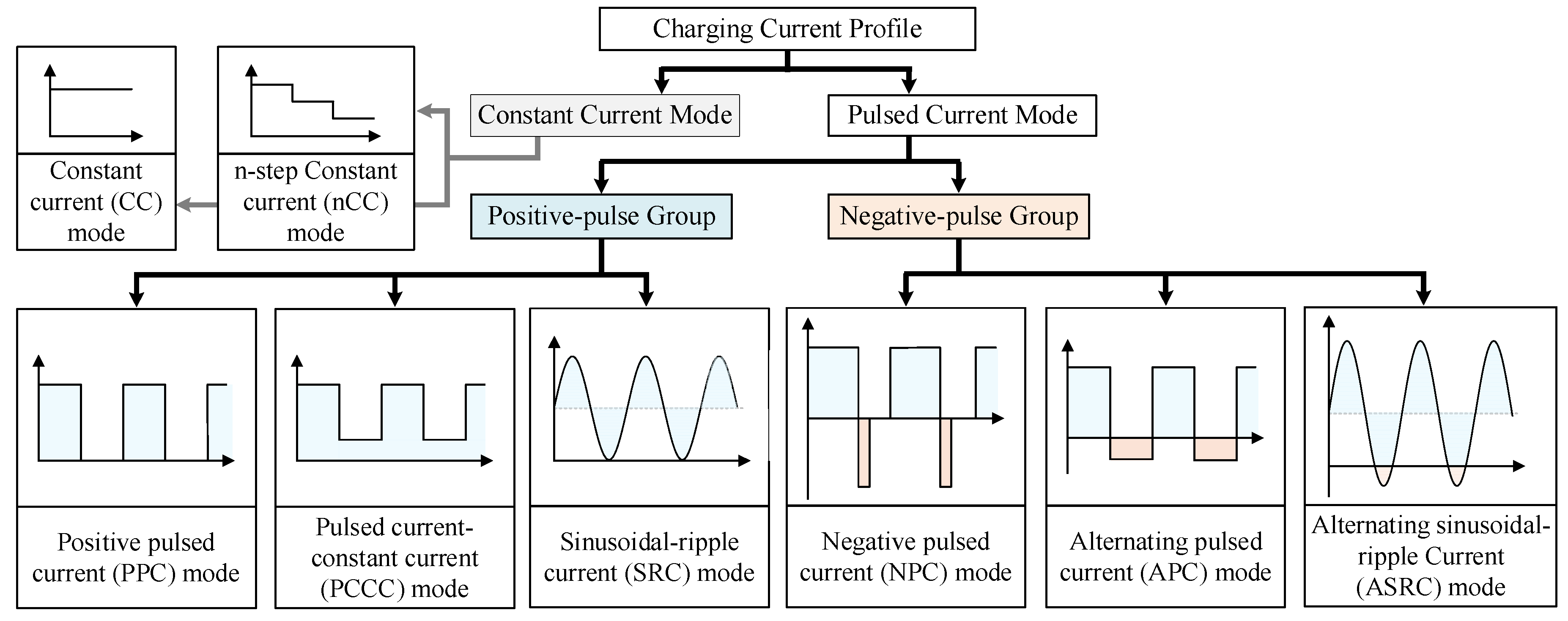 Figure 2 shows the classification of charging current profiles, which can be categorized as CC mode and pulsed current mode. Several pulsed current modes have been proposed to improve battery charging performance and thermal safety [