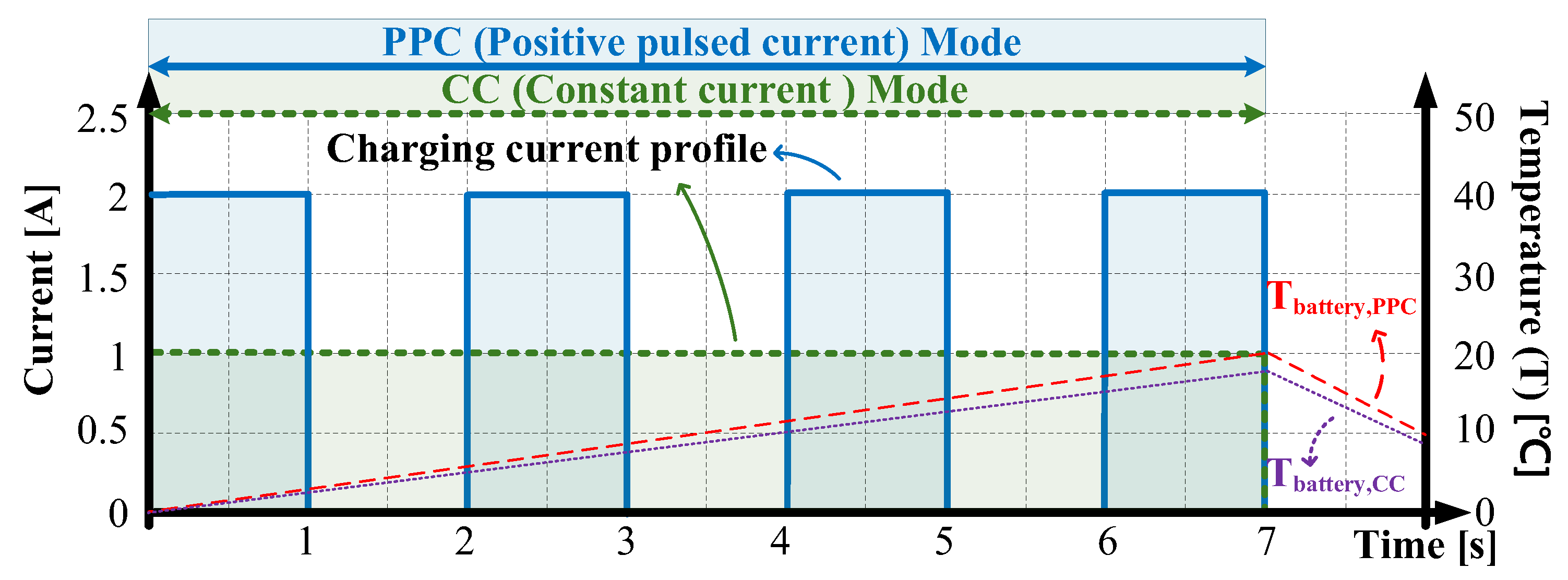 As analyzed in the preceding sections, both PPC and CC modes have demonstrated superior characteristics in terms of thermal safety and charging efficiency. Accordingly, the proposed hybrid charging profile incorporates these two modes at the front and rear sections of the current waveform, as illustrated in