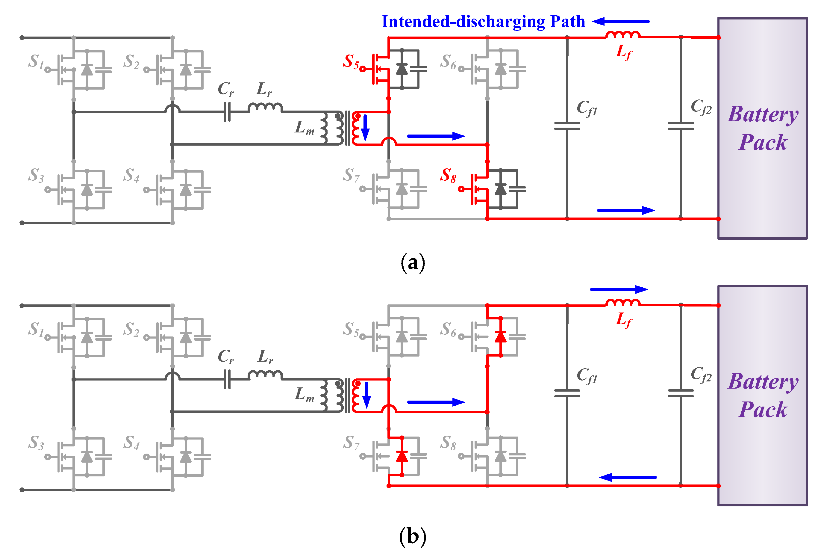 Lf and the transformer’s leakage inductance. The stored energy in these components can subsequently return to the battery by turning off all secondary-side switches, forming a free-wheeling path through anti-parallel diodes, as shown in