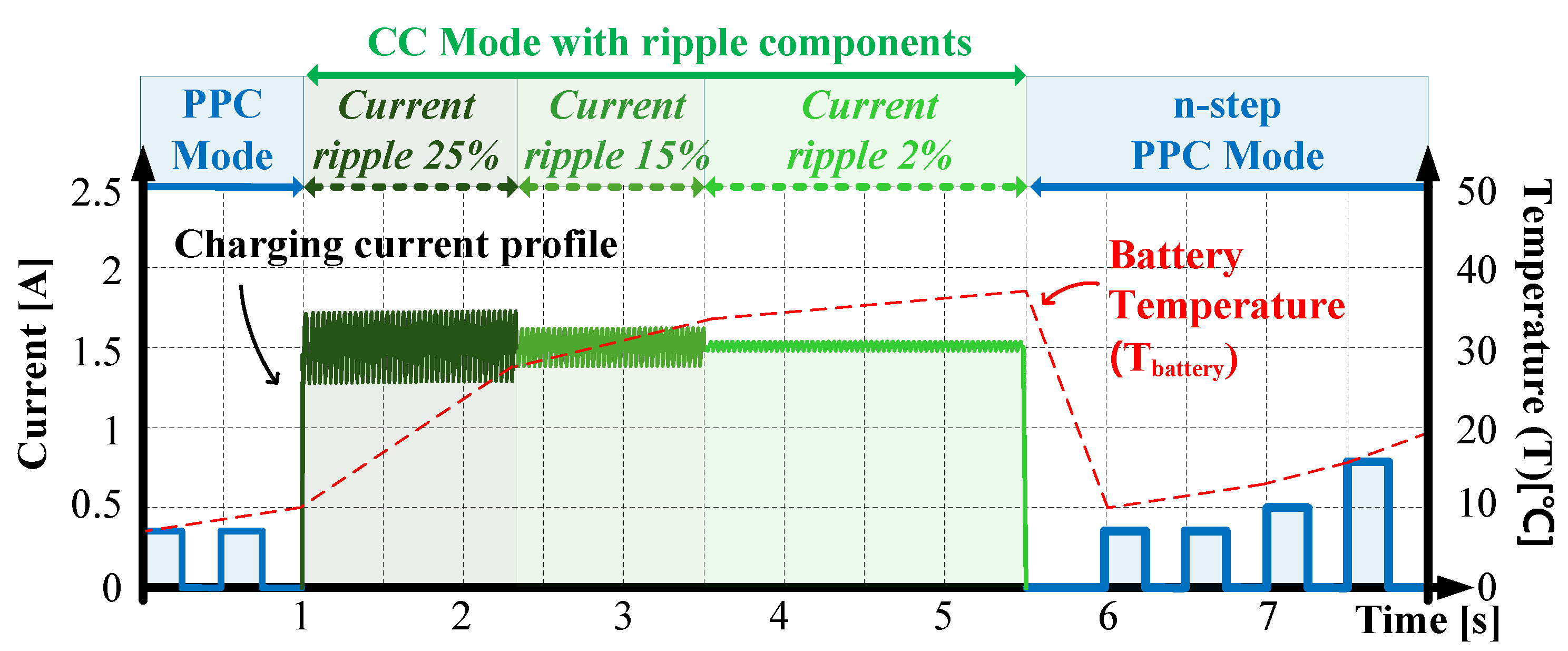 Figure 5. In this mode, the average charging current is kept constant, while the ripple component of the output current is modulated to actively manage the thermal behavior of the battery. Specifically, a high-frequency ripple is superimposed on the DC current, with the ripple amplitude adaptively adjusted to temperature conditions (e.g., 25%, 15%, or 2%) to induce controlled heating. Experimental results confirm that larger ripple amplitudes produce greater temperature rise in the battery. The degradation effect of high-frequency ripple currents on battery lifetime is significantly less pronounced compared to that of low-frequency ripples [