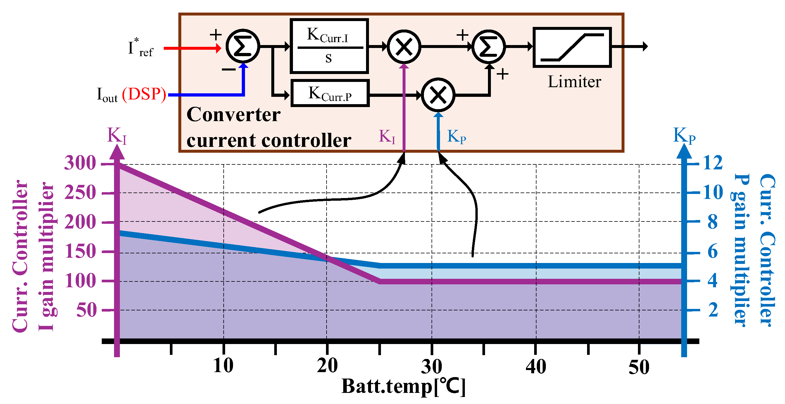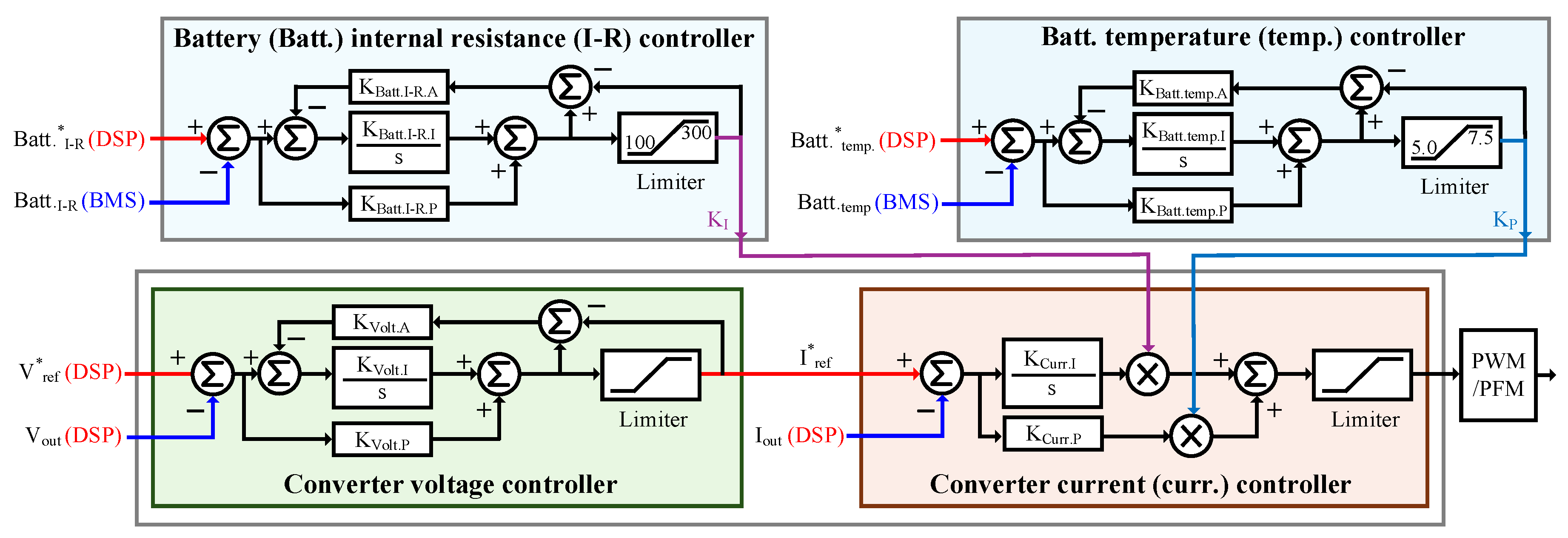 The setpoints and measured values for both voltage and current controllers are handled via a digital signal processor (DSP), while the gain multipliers from the temperature and resistance controllers are computed in the DSP using real-time inputs from the battery management system (BMS), which provides temperature and internal resistance information. The battery temperature controller directly modulates the P-gain of the PI controller in response to instantaneous temperature variation, allowing fast dynamic control of ripple amplitude. In contrast, the battery internal resistance controller updates the I-gain based on cumulative resistance changes, contributing to improved steady-state accuracy and long-term control stability.
