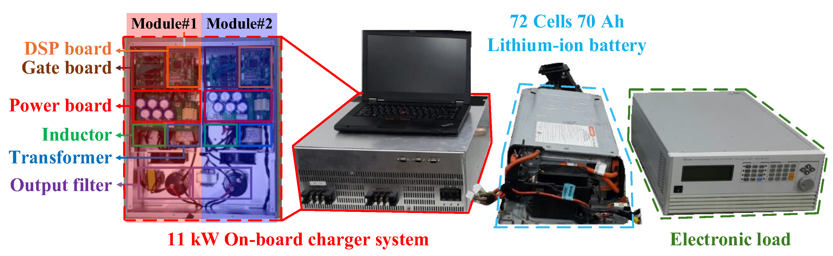 Figure 8 summarizes the experimental setup used to validate the proposed charging-current control method. A 11 kW OBC is constructed by connecting two 5.5 kW modules with input and output parallel. Module#1 and Module#2 are indicated in