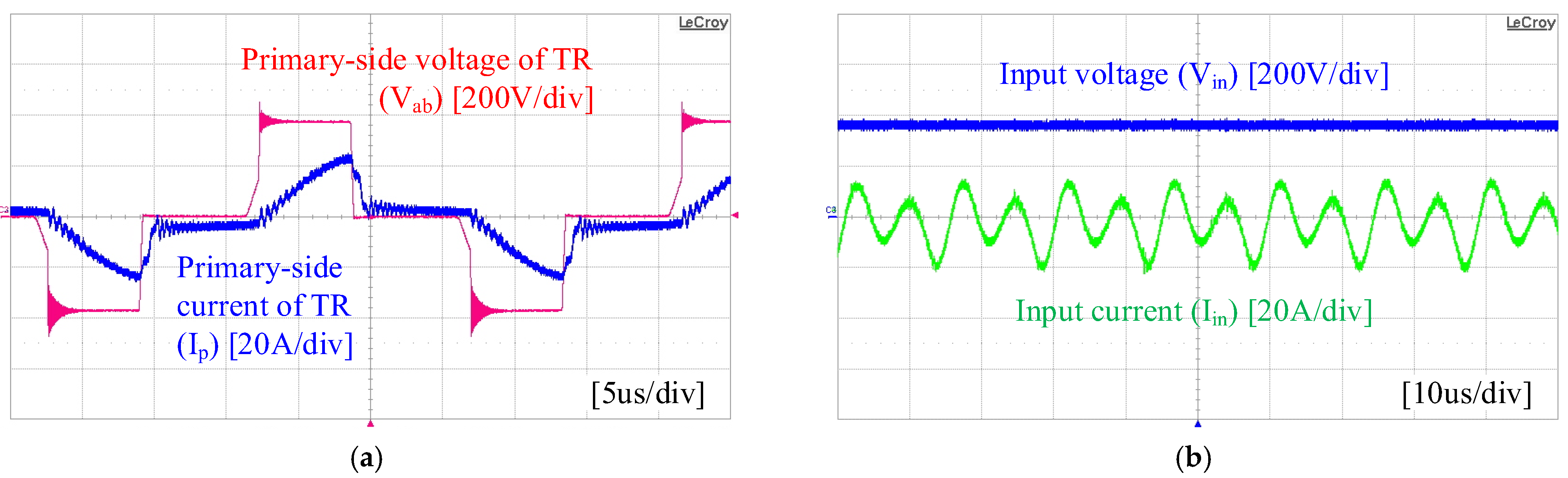Figure 10a shows the voltage and current waveforms across the transformer of the LLC resonant converter under steady-state operation. The results confirm that zero-voltage switching (ZVS) is successfully achieved.