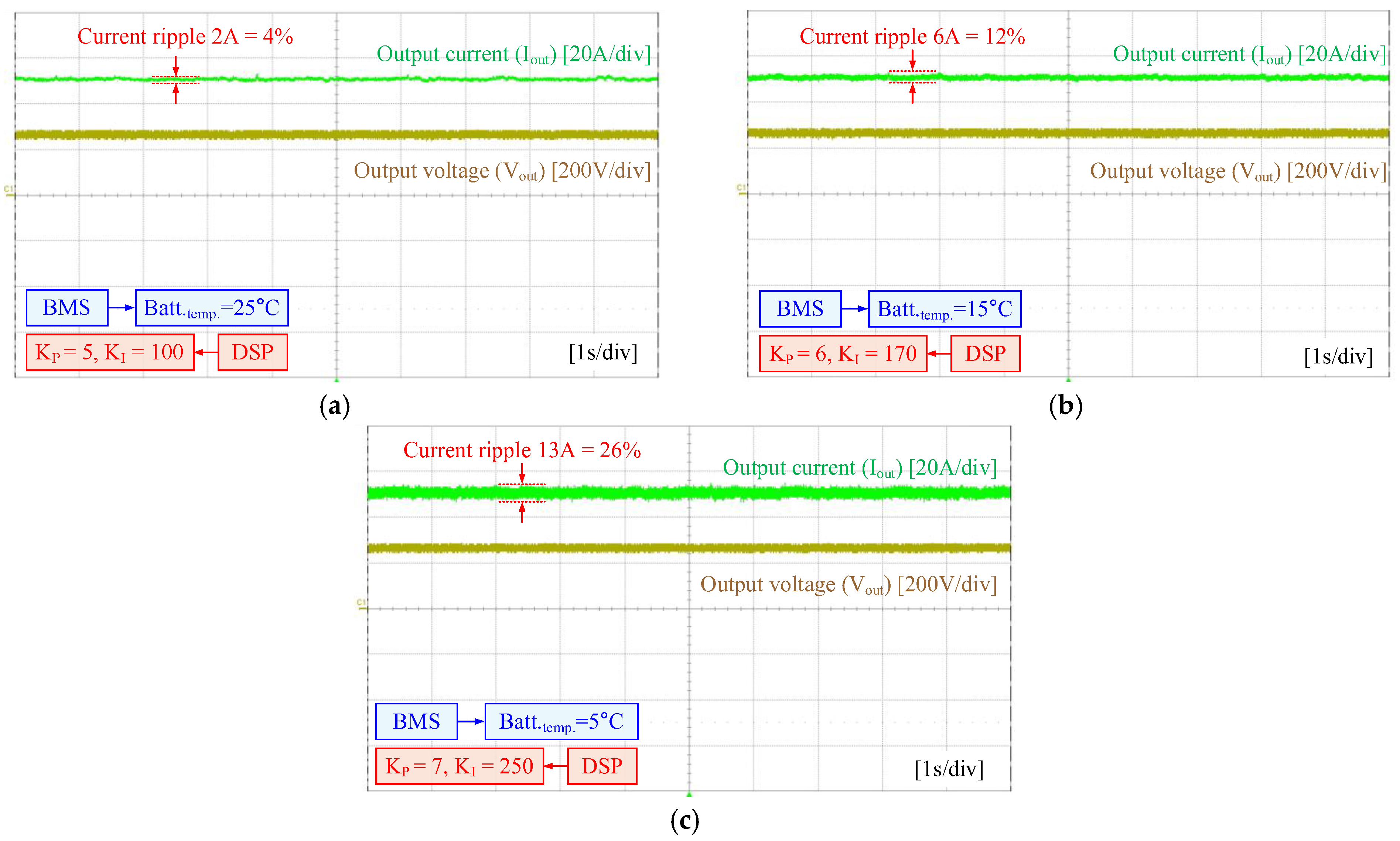 Figure 11 presents experimental results of the proposed CC charging strategy incorporating PI-based ripple control. The voltage and current reference values are set to 240 V and 50 A, respectively. As illustrated in