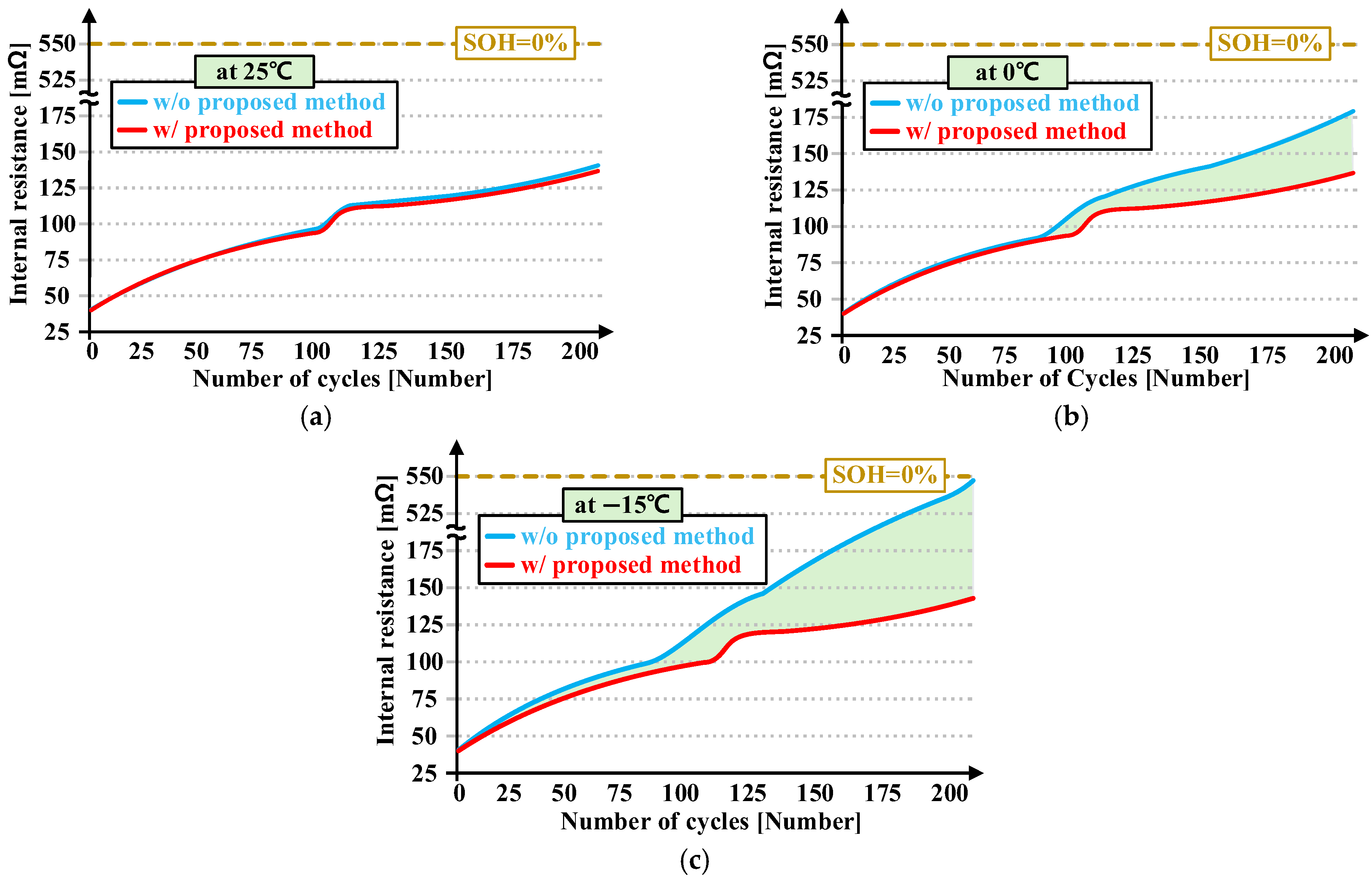 Figure 13a shows the result under 25 °C. Since this temperature lies within the optimal operating range, only a marginal difference is observed between the CC charging method (regarded as a without proposed method) and the proposed method in terms of internal resistance increase, indicating negligible lifetime improvement in this condition.