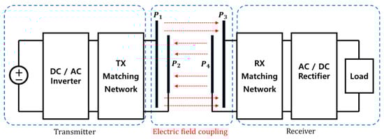 Figure 2 illustrates a typical stacked ER-WPT system configuration, consisting of multiple layers of electrically resonant metal plates, generally arranged in a vertical stack of four plates. These metal plates are electrically connected within both the transmitter and receiver units. The DC voltage source applied at the transmitter is converted to AC voltage via an inverter. Subsequently, the signal passes through an impedance matching network composed of LC elements, designed to maximize electric field resonance and coupling at a specific frequency. This impedance matching circuit together with the plate structure constitutes the coupler in WPT systems. To achieve high power transfer efficiency, analyzing the electromagnetic characteristics of the coupler is essential. This study focuses on designing such a coupler.