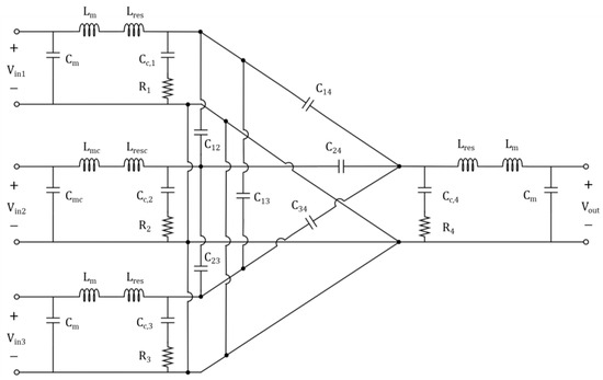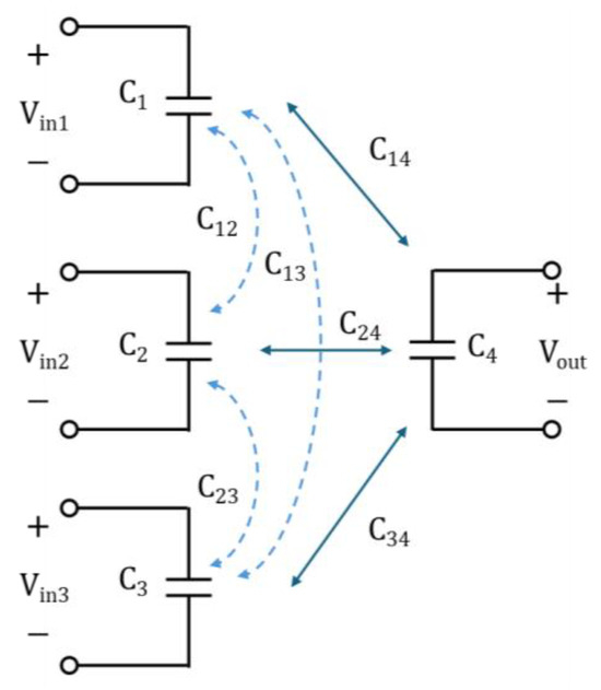 In Figure 3, each mutual coupling element is represented by a Pi-model-connected circuit, as defined in Figure 4, which includes the impedance matching circuits proposed in this study. The model corresponds to a configuration with three transmitters and one receiver, applicable not only to a 3-to-1 structure but also to larger scales. Here, (where i is the port number) represents the self-capacitance of each coupler, and denotes the mutual capacitance between couplers. Because the self-capacitance forms an equivalent circuit with multiple ports via the Pi-model, calculations of multiple mutual capacitances are necessary.