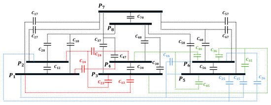 Self-capacitance and mutual capacitance are calculated based on numerous capacitances formed between the plates. The diagram in Figure 5 illustrates capacitances formed among eight plates. According to the fundamental capacitance calculation formulas [27], the four-port network capacitances are computed as in Equation (2).