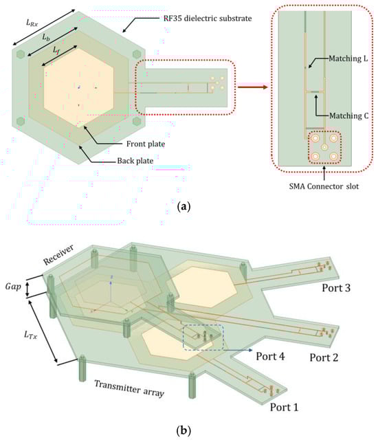 Figure 6 shows the proposed single coupler model of the hexagonal ER-WPT, designed and analyzed using Ansys HFSS R2021. Taconic RF-35 substrates are used, with copper sheets processed on both sides to form the hexagonal plates. The back plate is located on the substrate’s bottom side, and the front plate on the top. An optimal plate ratio exists to maximize mutual capacitance in stacked structures [23]. In the proposed design, the front plate’s side length is 70% of the back plate’s. Matching circuit traces connect to each plate via vias through the dielectric substrate. Figure 6a shows the SISO coupler model, where transmitter and receiver front plates face each other. The matching circuit on the substrate uses copper traces 0.3 mm wide, with SMA connectors implemented for measurements. The same applies to the MISO coupler shown in Figure 6b, where three hexagonal ER-WPT couplers are arranged in a triangular layout. One coupler requires a longer trace and exhibits slightly different impedance characteristics. The receiver uses the SISO coupler model unchanged. Detailed design parameters are listed in Table 4.