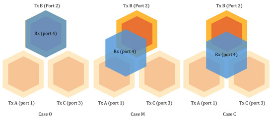 Analysis of the 3-to-1 structure’s electromagnetic characteristics for three representative receiver positions, as illustrated in Figure 7, provides dominant features applicable to further array expansion. The longer trace coupler among transmitters exhibits slightly different impedance, requiring separate analysis of coupling with Tx B and Tx C. Table 5 summarizes the measurement scenarios divided into three cases. Case O includes Rx aligned with Tx B or Tx C individually, with only the corresponding Tx active. Cases M and C involve multiple Tx units active due to non-alignment with a single Tx, requiring observation of couplings with Tx B and Tx C. Tx A and Tx C have identical electromagnetic properties and are collectively represented by Tx C.