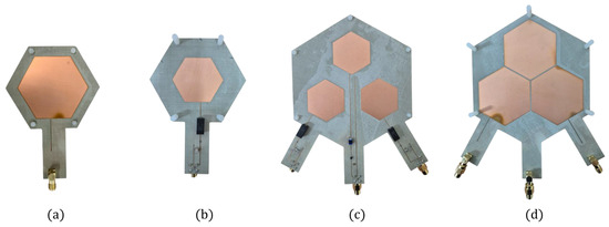 Fabricated models of Hexagonal ER-WPT coupler. (a) Top view of SISO coupler; (b) bottom view of SISO coupler; (c) top view of MISO Tx coupler; (d) bottom view of MISO Tx coupler.