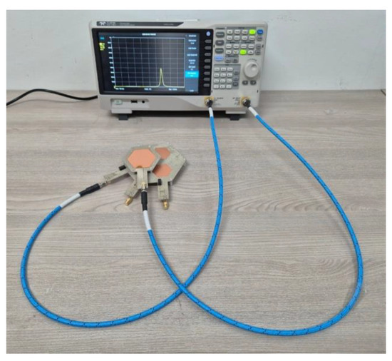 Figure 8a,b depicts the hexagonal SISO ER-WPT model, with the same receiver coupler applied to the MISO model. The assembly was supported by PVC structures and measured as shown in Figure 9. For the MISO coupler, measurements were performed by changing transmitter ports using a vector network analyzer (T3VNA3200, Teledyne LeCroy, Chestnut Ridge, NY, USA).