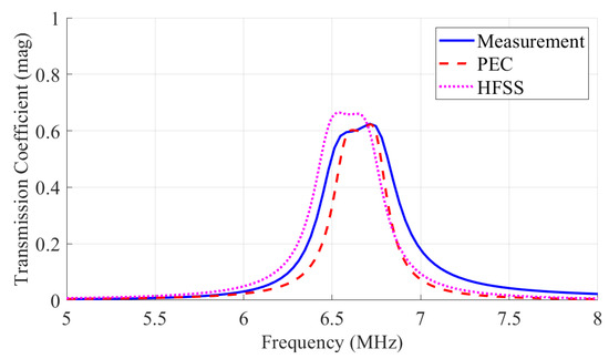 Figure 10 shows the transmission coefficient results for the SISO coupler obtained via the three methods. The measurement peak was 0.63, the HFSS peak was 0.66, and the PEC peak was 0.62, indicating generally consistent results. The measurement and PEC results matched within a 0.33% error. The overall lower peak values are attributed to the frequency characteristics of the components and inherent coupler losses. PEC analysis indicated approximately 8 Ω of resistive components and a 1 μH deviation in inductors, causing resonance frequency shifts and transmission loss.