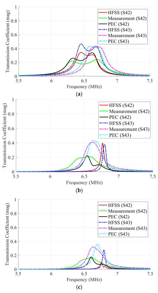 Comparison of transmission coefficients (S-parameter) in hexagonal MISO ER-WPT couplers. (a) Case O; (b) Case M; (c) Case C.