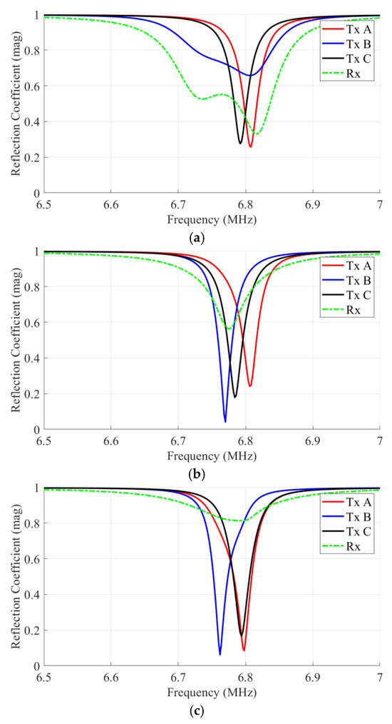 In addition to transmission coefficients, the reflection coefficients of Tx A, Tx B, Tx C, and the Rx were analyzed, as shown in Figure 12. These results were obtained from electromagnetic simulations based on the PEC model, in which measured loss elements were incorporated to reflect practical conditions. Across all three cases, clear resonance behavior is observed near 6.78 MHz. In Case O, the Tx aligned with the receiver shows the deepest return loss, while the other Tx ports exhibit weaker resonance. In Case M, two adjacent transmitters coupled to the receiver both display pronounced dips, with a slight frequency splitting due to mutual interaction. In Case C, all three transmitters show nearly identical resonance dips, and the receiver resonates at the same frequency, confirming uniform coupling to multiple transmitters.