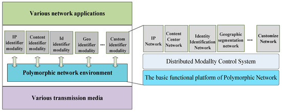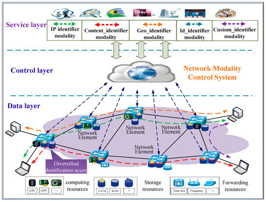 The control layer of the Polymorphic Network is composed of the network modality control system. The network modality control system implements polymorphic addressing and routing decisions to realize intelligent scheduling of underlying heterogeneous resources. It is responsible for implementing different modality management, developing different addressing and routing decisions, and forming resource scheduling methods for various network applications in the upper layer.