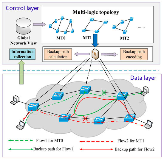 Although various network technologies have been designed to improve the technical shortcomings of the traditional internet, the research on failure tolerance mechanisms for nodes and links in the network is still limited. Over the past decade, the link speed in data centers has increased from 1 Gbps to 100 Gbps [4]. While link speeds have continuously improved, the robustness of the network has not been effectively enhanced. Studies [5] show that large-scale networks, such as data centers and wide-area networks, contain hundreds or even thousands of switches and connections, and various failures from nodes and links are common network failure events. For instance, in Microsoft’s data center wide-area network, the probability of at least one link failure occurring every 10 min is as high as 30%. Facing the diversified network environment in the future, the complexity and uncertainty of networks make their security and reliability highly challenging. When network nodes or links are attacked or encounter uncertain threats, it leads to a significant loss of packets, interruption of related network services, and seriously affects the quality of service. Although Software-Defined Networking (SDN) greatly enhances network management and control capabilities, these issues with node and link failures still persist, and failure recovery mechanisms still face issues such as inefficiency or high recovery costs [6]. Therefore, facing the complex network environment with frequent failures in the future, enhancing the failure tolerance ability of the network to ensure that packets can still be forwarded normally during network failures, has become an important research topic in both industry and academia [7].