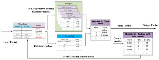 Figure 5 illustrates the failure recovery processing logic of the Polymorphic Network element. In the Polymorphic Network, network elements have pervasive caching capabilities. Here, the network element is equipped with two built-in registers. Register 1 is used to store the output port status table. The network element periodically detects the link status and stores the status information in Register 1. If the output port status is active, it indicates the link is normal, while inactive indicates a link failure. Register 2 is used to store the backup path information, which is pre-calculated by the controller based on the multi-topology backup path module and written to the register.