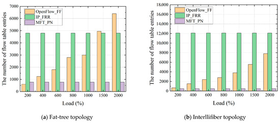 Figure 6 shows the flow table entries for backup paths under different traffic conditions. Since the reactive strategies occur after a failure happens, it does not require pre-installation of backup paths. Therefore, this experiment only considers proactive strategies. As shown in Figure 6, the curve of OpenFlow-FF grows rapidly as the number of flows increases. Since OpenFlow-FF needs to calculate a backup path for each flow individually, the total number of flow table entries for backup paths is linearly dependent on the number of flows. Hence, OpenFlow-FF may lead to very high flow table storage overhead, and even flow table overflow. IP-FRR requires each switch to store backup next-hop entries for all terminals. As a result, IP-FRR still installs many flow table entries to install backup paths, which results in large flow table storage overhead in large-scale networks. MFT-PN calculates loop-free backup paths for each link based on the multi-topology. Each switch only needs to install a small number of flow table entries to reroute all flows encountering the same failure. For MFT-PN, the number of flow table entries required is independent of the number of terminals and flows in the network. Hence, MFT-PN greatly reduces the flow table storage overhead while improving the network’s scalability.