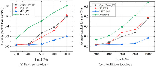 To analyze the performance of different schemes in handling link failures, this experiment injects flows into the network at varying rates, ranging from 0 to 1000 Mbps. In each round of the experiment, we simulate link failures by randomly removing links, and then record the packet loss rate for flows encountering link failures. Figure 7 shows the average packet loss rate of different strategies during failure recovery. As seen in Figure 7, the reactive strategy resulted in a significant amount of packet loss. This is because reactive strategies will cause a delay in interaction between the switch and the controller, as well as in recalculating the path, and cause a significant amount of packet loss. Among the three proactive strategies, the MFT-PN has the lowest packet loss rate. Since OpenFlow-FF only implements failure recovery at the ingress switch, packets encountering these failures are naturally discarded, leading to a higher packet loss rate. IP-FRR adopts the shortest path algorithm to calculate the backup next hop for all terminals. However, IP-FRR still has loops in the path calculation process and cannot cope with some multi-failure scenarios. The MFT-PN is a free-loop link-based backup path algorithm that adopts different backup path strategies for different logical topologies. When encountering link failures, the MFT-PN can quickly migrate traffic and guide flow to redirect to different backup paths, with minimal impact on network congestion. Therefore, the MFT-PN has the lowest packet loss rate.