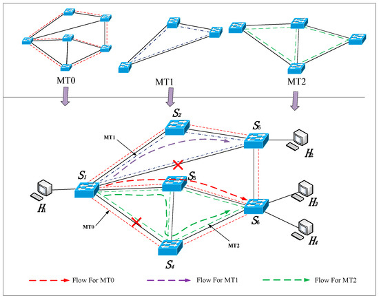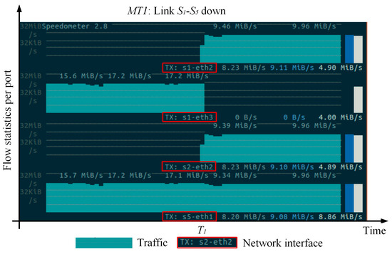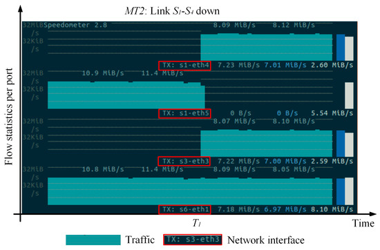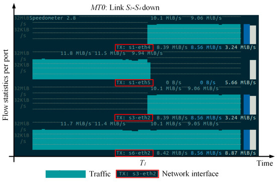 This experiment tests the multi-failure recovery capability of the MFT-PN. We construct three logical topologies (i.e., MT0, MT1, and MT2) for three types of service flows, with each logical topology using different backup path strategies. The failure recovery scenarios based on multi-topology are shown in Figure 8. During the experiment, we generate three service flows for each logical topology: for MT0, for MT1, and for MT2. We simulate link failures by randomly removing links and then record the path trajectory of traffic. During the experiment, we simulate the failure of physical links and . According to the backup path strategies calculated by the control layer for these three logical topologies, the paths for MT0, MT1, and MT2 are as follows: MT0: , MT1: , and MT2: . Figure 9, Figure 10 and Figure 11 show the path trajectory changes in three types of flows before and after the failures. As can be seen from Figure 8, Figure 9, Figure 10 and Figure 11, at time 0~T1, the original paths for three flows are , , , respectively, for MT0, MT1, and MT2. When the links and fail, the paths for the three flows quickly switch to new backup paths , and . It can be observed that MFT-PN effectively avoids loop issues when calculating backup paths, and three flows at the destination hosts , , and remain continuous. Furthermore, the path switch at times T1 and T2 happens with almost no delay, indicating that the flows can seamlessly switch paths. Therefore, MFT-PN’s multi-topology loop-free link backup path algorithm greatly improves the network’s ability to cope with multiple failures and maintains a lower failure recovery time.