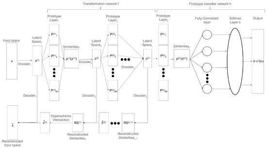 Figure 1 shows that the forward flow begins in the input space, followed by the first encoder, which maps the input data to a latent space. Then, the transformation network f comprises L-1 stacked triples consisting of a prototype layer, the calculation of a similarity vector, and an encoder for the following layer. Finally, the prototype classifier network h takes as input the last prototype layer (L), calculates the similarity vector, and passes the results through a linear mapping with a subsequent softmax layer that produces the estimated classification distribution of an input.