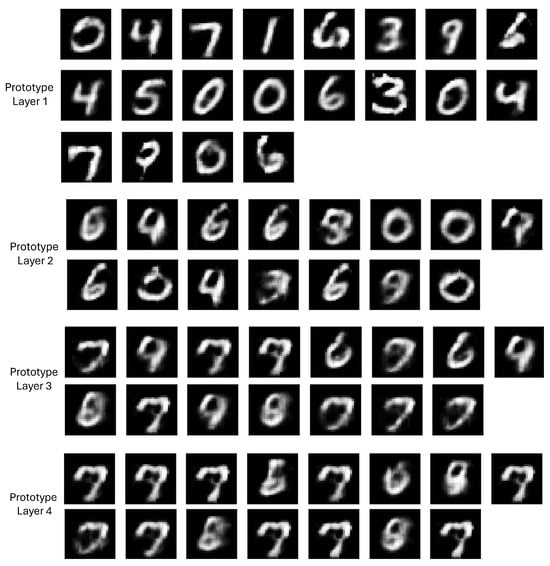 Interpretability, however, diminishes with increasing network depth. As illustrated in Figure 2, reconstructed prototypes from all four layers are visually compared. Prototypes in the first layer exhibit clearly defined glyphs, each distinctly associated with a specific digit class. This observation confirms that the autoencoder, in conjunction with the regularization terms, effectively aligns prototypes with the underlying data manifold. By layer 2, the prototypes lose fine-grained details and become more abstract, although they still retain rough class-specific contours. In layers 3 and 4, interpretability degrades substantially: the reconstructed shapes converge into nearly indistinguishable forms, differentiated only by subtle intensity variations and with weakly class-informative interpretable patterns. Despite this loss in human interpretability, the softmax-normalized weight matrix yields a NNE score of 0.26, indicating that the classifier maintains a coherent and class-specific internal representation, even as the prototypes themselves become less visually discernible. This observation is particularly significant, as it indicates that the final-layer prototypes retain sufficient information to support accurate classification while simultaneously integrating multiple visual patterns. This behavior is a consequence of the decreasing dimensionality across successive layers, which compels the network to fuse lower-level features. Accordingly, the process can be interpreted as a hierarchical compositional mechanism that preserves discriminative attributes across layers.