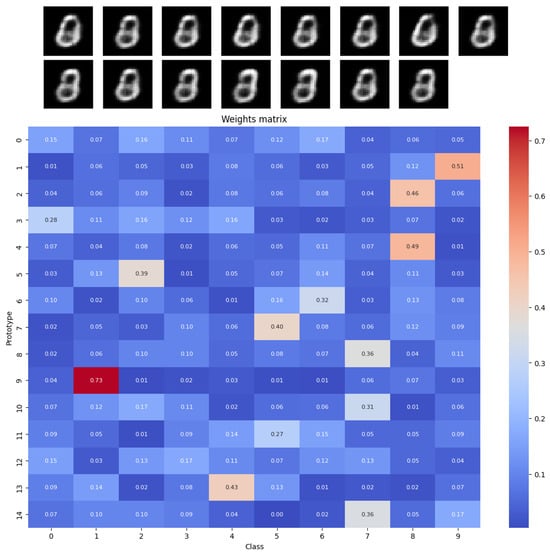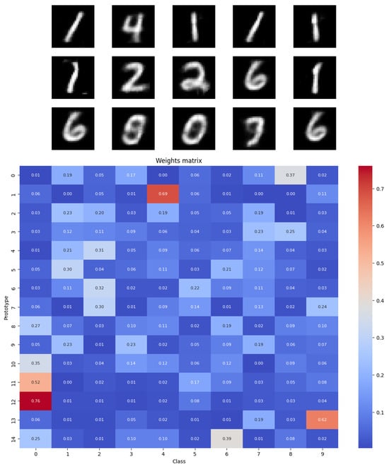 Despite the substantial reduction in network depth, the distilled model achieved an accuracy statistically indistinguishable from that of the baseline. Moreover, its weight matrix maintained coherence, with an NNE of 0.18. To assess whether this performance could be attributed to the information encoded in the transferred prototypes, we repeated the experiment using randomly initialized prototype vectors, which were likewise frozen during training. Contrary to our initial hypothesis, the network again attained comparable accuracy and produced sharply defined reconstructed prototypes. This suggests that the raw numerical values of the prototypes, in isolation, contribute little semantic content. Rather, interpretability appears to arise from the dynamics of the autoencoder and the spatial configuration of the prototypes within the latent space. Notably, the geometry of this space retains semantic structure: prototypes corresponding to visually similar digits, such as 8 and 9, are positioned closely, whereas those representing semantically distant digits, such as 2 and 9, are more widely separated. It is also worth noting that incorrect associations appear in the weight matrix (Figure 4), where prototype 12 (row 11) is assigned to class ‘0’, whereas it can be visually interpreted as an ‘8’ or ‘9’. We postulate that this latent space organization underlies the richer structure observed in the weight matrix when training begins with learned or trainable prototypes as opposed to random ones. These findings motivated the follow-up experiment described in the subsequent section, in which the network was trained end-to-end using randomly initialized, frozen prototypes. This design aimed to isolate the contribution of latent space geometry from the influence of prototype initialization.