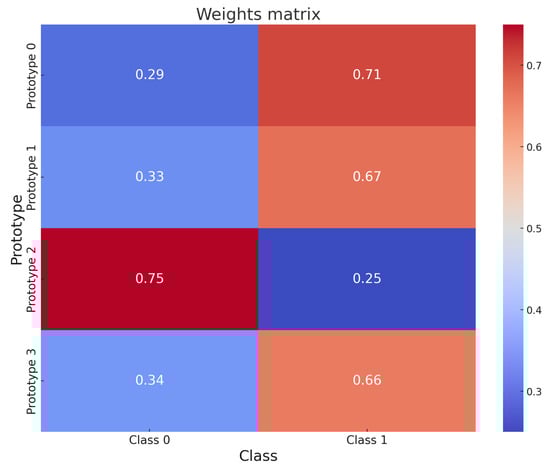 We retained the deep prototype architecture of the previous experiments, but specified a four-layer prototype hierarchy where each pair denotes the latent dimensionality, and the number of prototypes. The network was trained for 370 epochs with Adam (learning rate = ) and early stopping after 100 epochs without validation improvement. The highest validation accuracy achieved was 99.49%, with a final test accuracy of 99.48%. Despite this strong predictive performance, the interpretability metrics were less encouraging. Specifically, the softmax-normalized weight matrix of the final classification layer exhibited a NNE of , indicating a relatively flat association between prototypes and class labels. Furthermore, two of the four prototypes reconstructed from the deepest layer resembled noisy, amorphous “clouds” (see Figure 5) rather than well-defined digit patterns, and the weight matrix (see Figure 6) deviated substantially from a one-hot configuration. Regarding class purity or faithfulness, Figure 6 shows a faithfulness of 1/4, where all prototypes are assigned to class 1, but prototype 2 is correctly assigned to 0. This example is representative of the results achieved with other instances, which have been tested under human supervision.