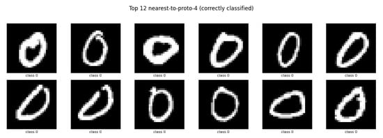 A detailed examination of the distilled model revealed an noteworthy behavior. Prototype #4, whose reconstruction clearly depicts a digit “0” (see Figure 7), is associated by the weight matrix with the ’others’ class with a probability of 66 %. An analysis of the twelve test images with latent encodings closest to this prototype (Figure 8) confirms that all correspond to well-formed instances of the digit “0”, each correctly classified as class “0”. Consequently, the prototype provides clear visual evidence of the digit “0” while functionally contributing to the decision for the opposing class. Because the mapping between prototypes and classes is learned independently of the visual characteristics of the prototypes, users lacking access to the weight matrix may be misled into believing that the model’s predictions for the “others” class are based on archetypal non-zero digits, when in fact, the decisive signal is anchored in a visually canonical zero.
