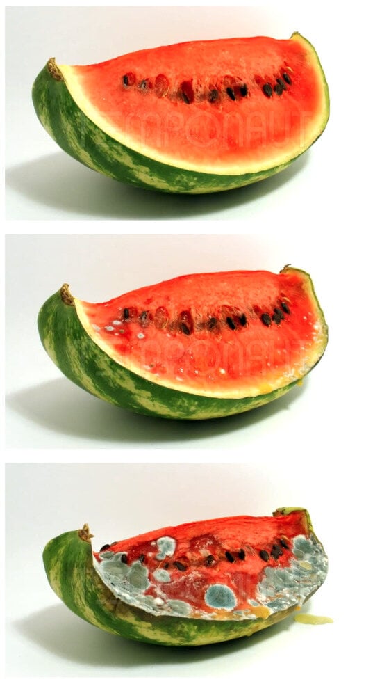 Original watermelon images from FruitQ dataset. At the top is an image labeled as good, in the middle an image labeled as mild and at the bottom, one image labeled as rotten.
