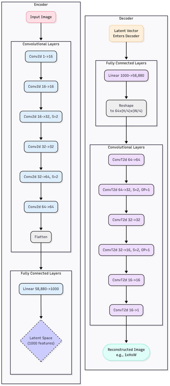 Diagram of the internal autoencoder architecture. On the left is the encoder with two steps; on the right is the decoder with two corresponding inverse steps to reconstruct the input image.