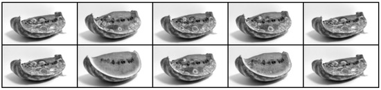 All the original watermelon images have three color channels and a 1280 by 720 pixel resolution. Figure 2 shows three examples of the original images selected. The distribution of label categories includes 150 rotten images, 53 mild images, and 51 good images.