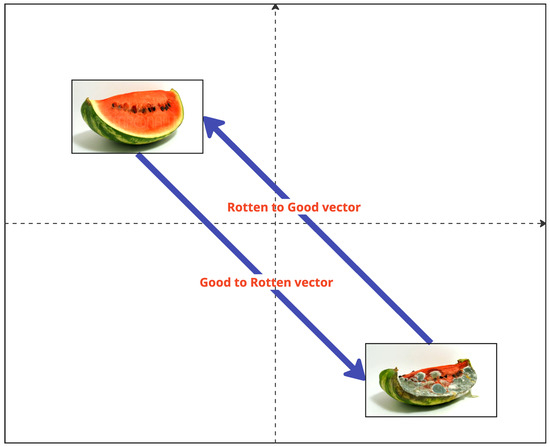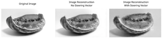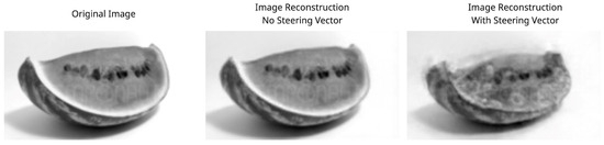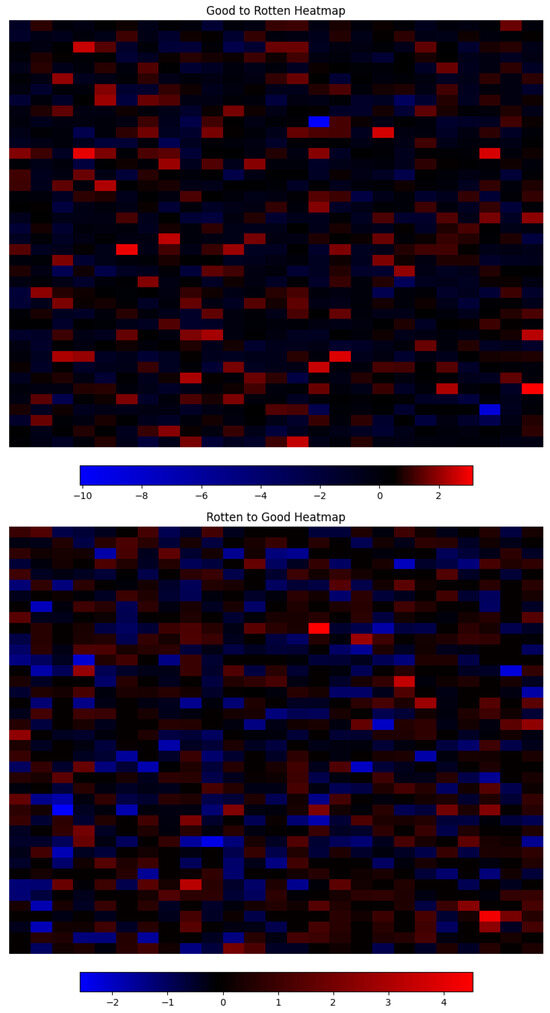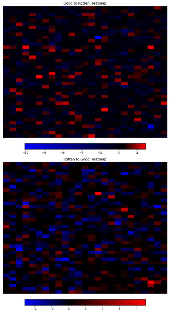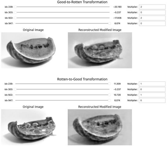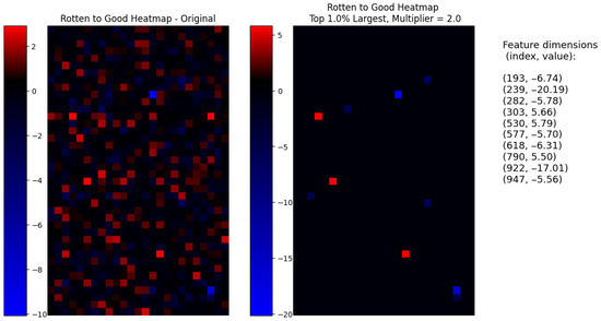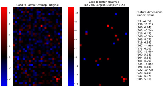 A similar result is shown in the opposite transformation in Figure 22, going from the rotten to the good attribute. In this case, by selecting and , only 10 out of 1000 dimensions, we achieve an even better reconstruction than the original parameters achieved. It can be observed how the volume of the subject is better integrated into the rest of the image, and there are fewer coloration artifacts where mold marks used to be and the reconstruction is less blurry. There is, however, a negative effect on the background color, which is noticeably darker. If we inspect the rest of the images, we can see how the background becomes darker as the multiplier and dimensions grow, suggesting that this is, in fact, an entangled attribute that was not fully disentangled during the learning process. In Figure 24, we visualize the corresponding interpretable selection heatmap along with the dimension–value pairs of the steering vector elements that achieved this manipulation.