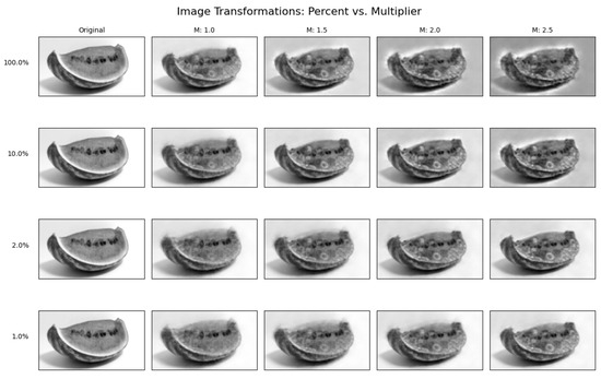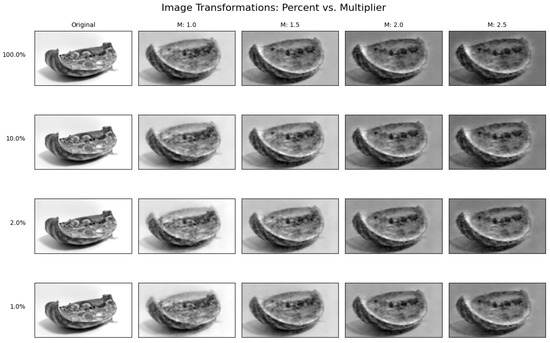 Grid of post-perturbation good-to-rotten image reconstructions. Vertical axis shows magnitude filter; horizontal axis shows the multiplier m. Original image reconstruction uses and .