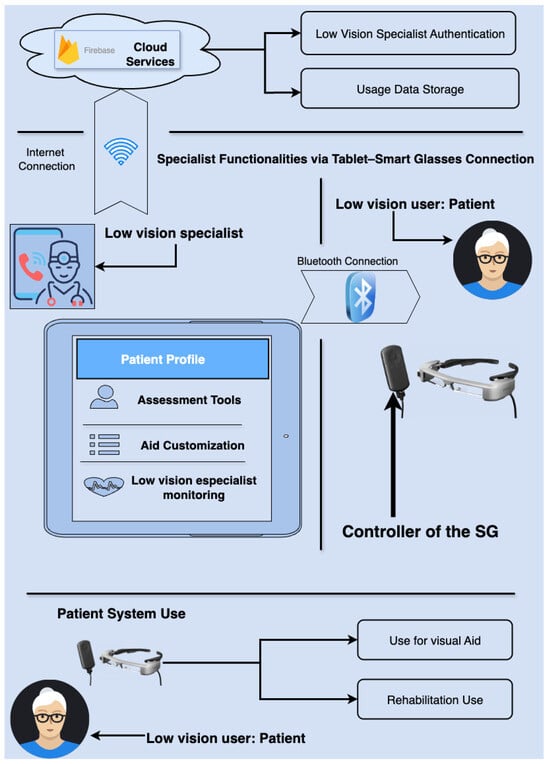 The SG selected for the system, the EPSON MOVERIO BT-350 (Seiko Epson Corporation, Suwa, Nagano, Japan) [65], has two displays, each of which has a field of view of 20° horizontally, 11.3° vertically, and 23° diagonally. The SG has Bluetooth Smart Ready connection and incorporates a controller, which is the physical device integrated with the glasses that enables interaction and control. This controller is where the software corresponding to the visual aid is implemented, allowing the user to manage the system functions directly through the SG. In Figure 1, this is explicitly represented with an arrow denoting the controller, making its role within the system clearer. The camera is located at one end of the glasses and has as a complement of a tilting an external physical solar filter. The displays have a Si OLED display and Intel® Atom™ x5 CPU (Intel Corporation, Santa Clara, CA, USA) with Quad Core 1.44 GHz and 2 GB of RAM. In reference [36], a classification of HDMs is proposed based on, first, how the visual information is transmitted; second, according to its usability; and third, according to its optical design. In addition, the ability to expand the perceived visual field of this model is mentioned, information that helped in the choice of this model. As a hardware tool for the specialist, a LENOVO tablet model TB-x505F (Lenovo Group Limited, Beijing, China) with an Android 10 operating system is used.