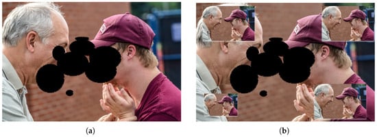 The system, given the characteristics of the SG, allows for bioptic vision and visual scanning. Since the EPSON design is based on near-eye displays that project a transparent image in front of the eye [36], the projected image can be set to the best viewing area of the patient by projecting it onto the required area of the displays. This allows the patient to have a minified image and real vision at the same time. The system displays the image with minification, enabling the patient to perceive the entire figure, albeit at a reduced size. Figure 2a illustrates the vision of a user with central vision loss, while Figure 2b shows the enhanced vision when using Retiplus.
