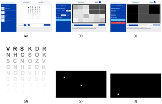 Evaluation functionalities represent the options on the screen (Figure 3). (a) Pelli–Robson contrast test evaluation menu for specialist. (b) Display for the visual field specialist during the test and small squares. (c) Display for the visual scan specialist during the test. (d) Pelli–Robson test for patients. (e) Visual field test for patients. (f) Visual scanning test for patients.