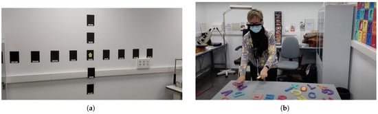 In the digital optotypes, an Amsler Grid [67] has been incorporated to assess potential visual deficiencies. Optotypes were also included for visual acuity equivalent to 4 m or for low vision the one corresponding to 2 m and optotypes for contrast evaluation with the Pelli–Robson test (Figure 4a). Additionally, on the left side of this screen, you can select to evaluate visual acuity at distances of either 2 or 4 m or perform the Amsler grid test. Figure 4d illustrates the virtual execution of the Pelli–Robson test.
