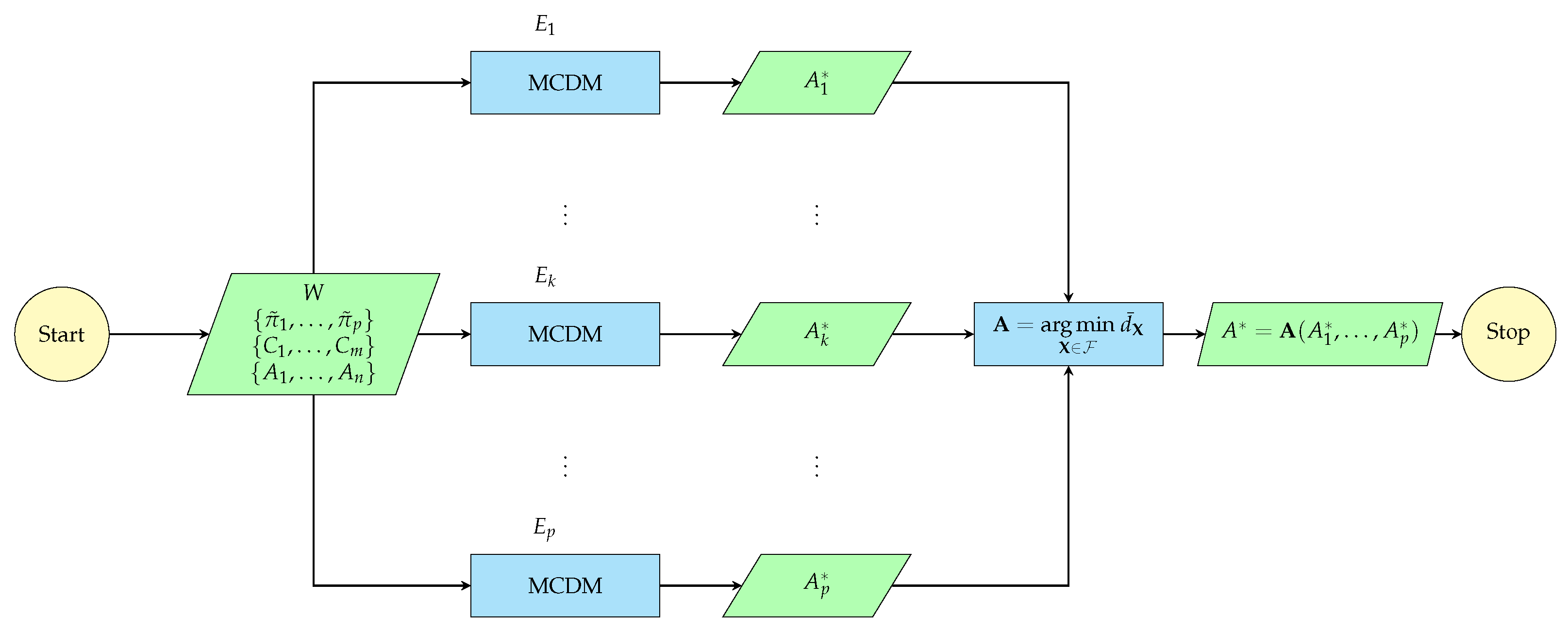 Finally, as a direction for future work, we intend to replace human experts with algorithmic surrogates (e.g., aggregation algorithms), thereby enabling the assignment of expert weights in a principled and reproducible manner. As already noted, eliciting from people is fraught with difficulties—not least because individuals typically resist being numerically scored. Algorithms, by contrast, are readily amenable to quantitative evaluation according to objective indicators such as execution time and memory footprint. In order to operationalise this idea, we could incorporate a fuzzy rule-based weighting module, specifically a Mamdani-type inference system composed of IF–THEN rules, which maps the aforementioned performance indicators to the weights assigned to the experts (algorithms). Moreover, because algorithmic experts consume and produce numerical values without additional interpretive overhead, their use directly addresses the limitation highlighted in Remark 10, aligning expert assessment with the algorithm’s native domain . Furthermore, we remark that it is, in general, rather difficult to determine a priori the types of algorithms and the objective metrics to be adopted in weighting them as experts. This is because the choice of algorithms may depend on a variety of factors, including the extent to which they are intrinsically linked to the specific decision problem. For instance, the experts (algorithms) employed in an MCGDM concerning a classification problem would inevitably differ from those used in a medical or healthcare-related MCGDM. A change in the type of experts necessarily implies a corresponding change in the objective metrics by which they are to be evaluated. For this reason, we have elected not to dwell on the particular categories of algorithms considered as experts here. However, one could envisage as experts the classical methodologies employed for the evaluation and classification of alternatives in decision-making problems (for instance, SAW, TOPSIS, and VIKOR, among others). In such a case, the decision metrics might include computational efficiency, memory consumption, sensitivity to rank reversal, and so forth.