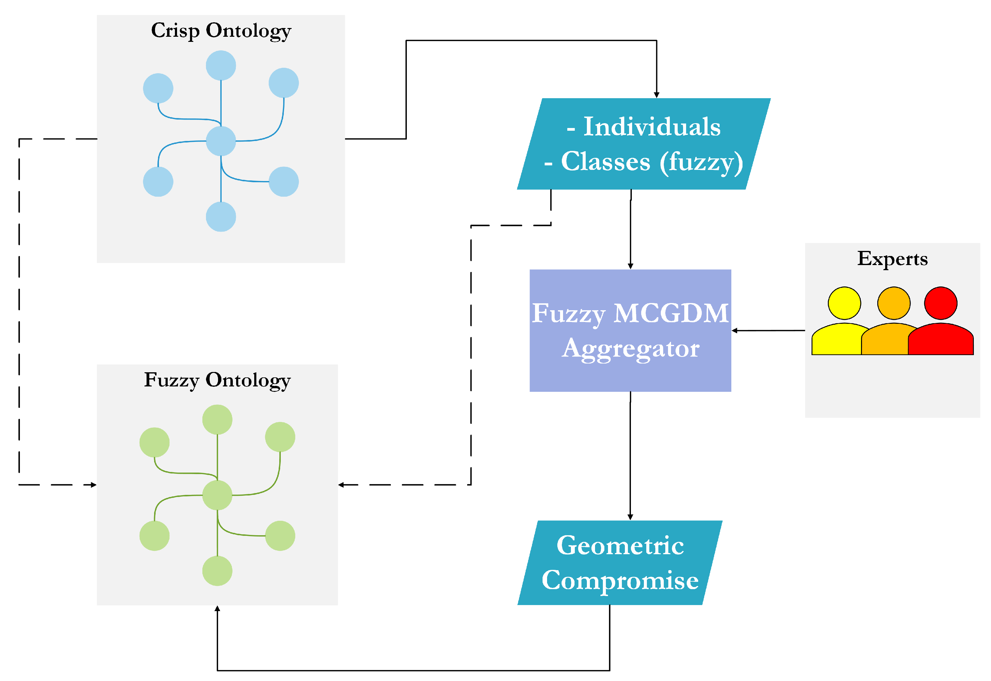 Section 3 introduces our MCGDM-based ontology fuzzification method, including the membership matrix, and defines an “overall best compromise” as the weighted mean of the experts’ optimal alternatives. Furthermore, we define the geometric compromise based on the minimal mean distance, ensuring that all expert opinions are incorporated while minimising deviation from each expert’s best alternatives.
