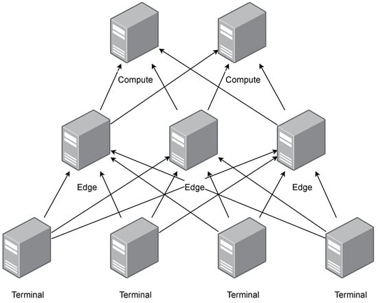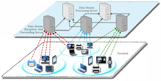 Smart logistics leverages emerging technologies such as the Internet of Things (IoT), Artificial Intelligence (AI), big data, and blockchain. These technologies enable digitalization, networking and intelligent management in the logistics process. Typical scenarios include dynamic path planning and automated sorting. These scenarios require AI models to perform millisecond-level inference on massive volumes of text, image and video data streams. The inference enhances the efficiency of the “transportation–warehousing–distribution” chain. Traditional cloud data centers offer abundant computational resources. However, the physical distance from logistics sites leads to high return-path latency. The latency limits real-time processing capabilities. To address this issue, the industry has gradually shifted computation toward the edge, establishing edge-intelligent computing frameworks. As shown in Figure 1, terminal data is first preprocessed by nearby edge servers before being sent to back-end nodes for deep analysis. The first row of servers in Figure 1 represents data stream reception and forwarding servers, which receive data from intelligent terminals and forward it to other servers. The second row represents data stream processing servers, which handle computation and analysis tasks. This work focuses on scheduling and forwarding, which are completed with minimal latency after data streams reach the forwarding server. To keep the focus on the receive–forward layer, transmission from terminals to the access network and its wireless variation are not modeled. Random wide-area network effects (packet loss, jitter, reordering), failure recovery, and sensitivity to MTU or jumbo frames are not considered. All experiments are conducted in a stable local area network to isolate and evaluate the contribution of this layer to end-to-end performance. This “computation offloading to the edge” strategy effectively reduces latency and alleviates backbone network load [1,2,3,4,5].