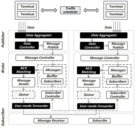 The dynamic scheduling layer ensures stable performance under varying workloads. It involves the traffic scheduler. It also involves parts of the message center and subscriber modules. The scheduler monitors resource usage, latency, and throughput in real time. Based on these measurements, it profiles each edge node. It then applies a load-balancing algorithm to allocate new terminal requests. The subscriber controller maintains subscription states. The subscriber module supports subscription requests and localized data handling.