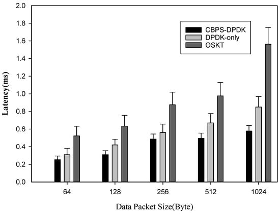 As shown in Figure 4, DPDK-Only achieves lower latency than OSKT across all packet sizes. The proposed CBPS-DPDK method achieves the lowest latency overall. Table 3 further confirms that CBPS-DPDK maintains both low latency and stable performance.