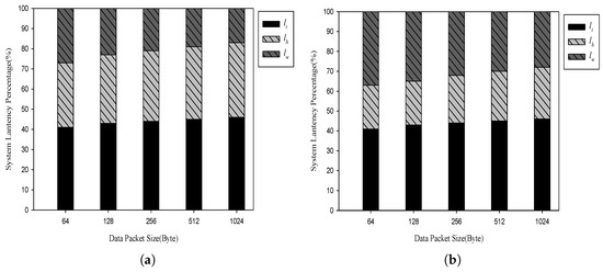 Latency composition (transmission, processing, queuing) under different packet sizes for (a) CBPS-DPDK and (b) DPDK-only.