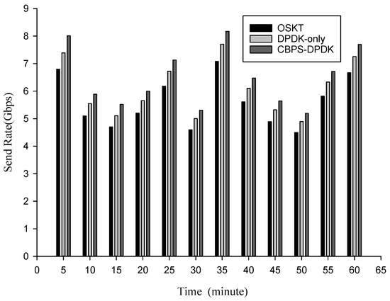 The transmission bitrate is defined in Formula (8), where higher values indicate better throughput performance. An automated test script was used to simulate continuous video stream data and the transmission bitrate of the three methods was measured over a one-hour period. As shown in Figure 6, the OSKT baseline achieved a maximum throughput of about 4.5 Gbps, which is significantly lower than the other two methods. The DPDK-only method improved performance but still did not reach the level of CBPS-DPDK. The proposed CBPS-DPDK method achieved throughput ranging from 5.2 Gbps to 8.17 Gbps, which is 15.4% higher than OSKT and 8.8% higher than DPDK-only. This result demonstrates that combining DPDK with a content-aware publish/subscribe model can significantly improve throughput under continuous high-concurrency video transmission.
