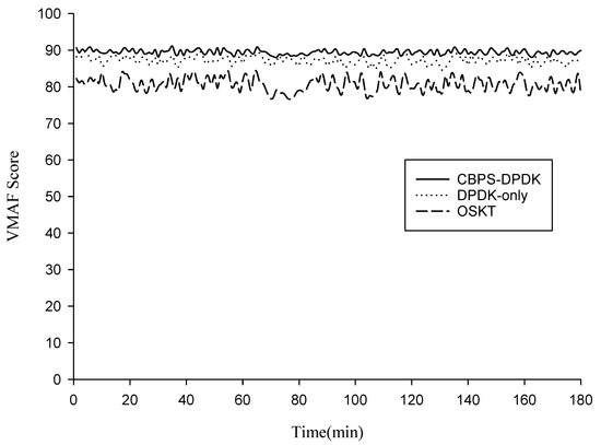 Subscriber-side video quality over 180 min measured by VMAF (0–100) for OSKT, DPDK-only, and CBPS-DPDK.