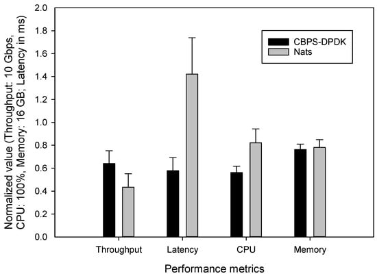 In terms of throughput, CBPS-DPDK achieves an average of 6.48 Gbps, exceeding DPDK-only (6.09 Gbps) and OSKT (5.60 Gbps). Although its throughput coefficient of variation (16.38%) is slightly higher than that of DPDK-only (16.24%) and OSKT (16.25%), the difference is minimal, reflecting robust performance stability under high-load conditions. In addition, to further evaluate system performance in the publish/subscribe scenario, experiments were conducted on CBPS-DPDK and NATS with a dataset size of 200,000 MB, as shown in Figure 8. At this scale, system resources were nearly saturated, which better reflected the differences between the two methods. The results show that in terms of throughput, the normalized value of CBPS-DPDK was 0.641, while that of NATS was 0.434. Throughput was normalized with an upper limit of 10 Gbps, corresponding to actual values of 6.41 Gbps and 4.34 Gbps, with the former being about 48% higher than the latter. In terms of latency, the mean value of CBPS-DPDK was 0.578 ms, while that of NATS was 1.421 ms, which is only 40.7% of the latter, showing a difference of nearly 2.5 times. For CPU utilization, CBPS-DPDK reached 0.562 (i.e., 56.2%), whereas NATS reached 0.821 (i.e., 82.1%), showing a reduction of about 31.6%. For memory usage, the normalized value of CBPS-DPDK was 0.763, corresponding to about 12.2 GB, while that of NATS was 0.781, or about 12.5 GB. These results indicate that CBPS-DPDK demonstrates clear advantages in throughput and latency, while also achieving higher resource efficiency in CPU and memory usage.