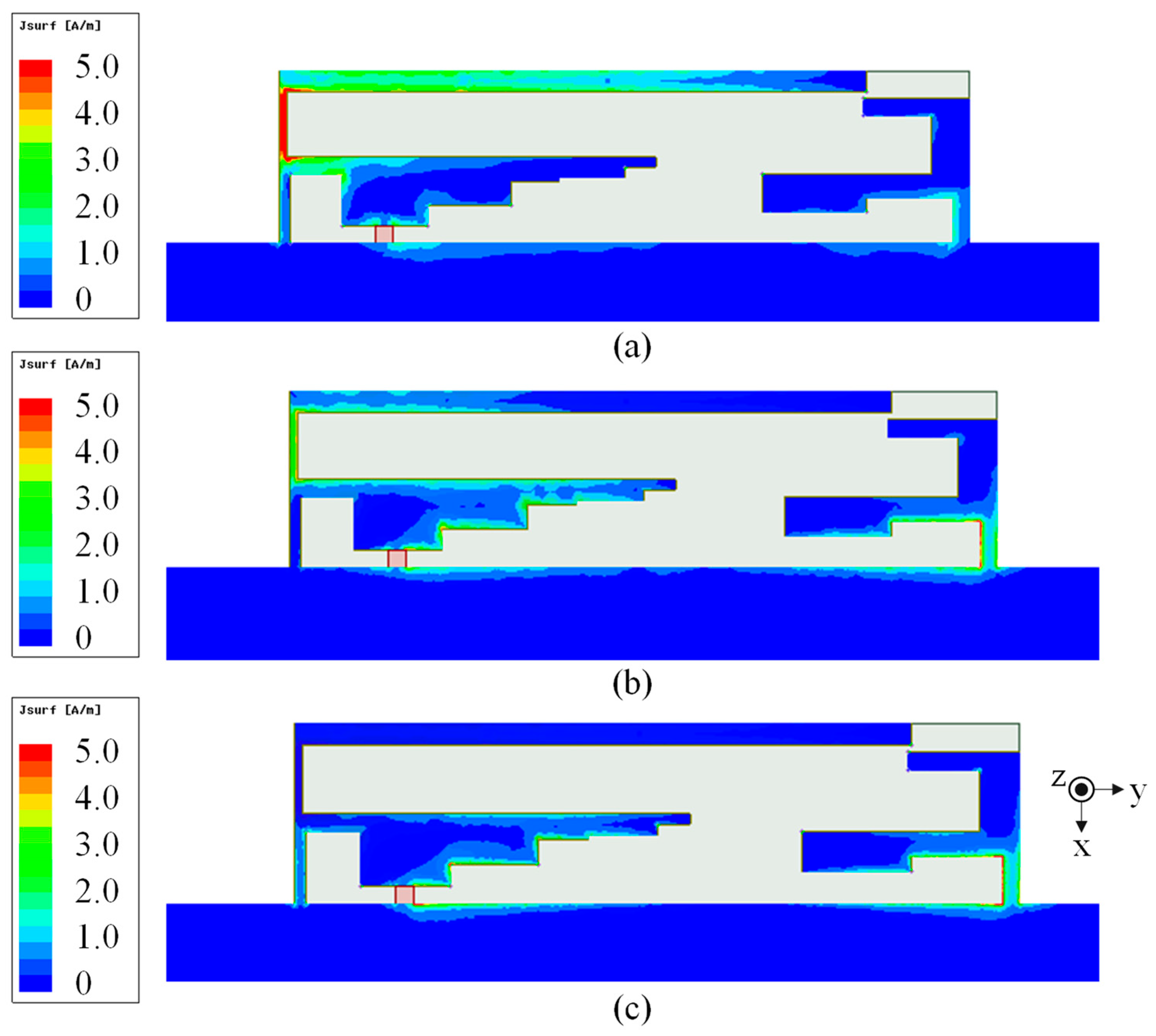 Figure 2c. The distinct segmentation of resonant regions confirms that the antenna achieves tri-band operation by distributing modal control across separate radiator sections.